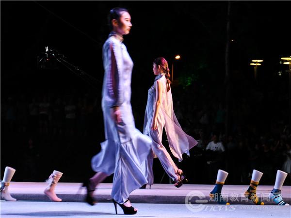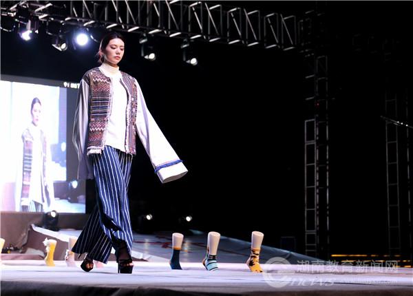 作品展共分为成衣服装、创意服装、创意袜品设计、礼服与轻奢商务男装展示四大篇章,服装风格丰富,类型多样,学生巧妙运用民族或时尚元素,诠释传统与创新、时尚与文化,展现了服装专业人才培养能力与成果。与湖南莎丽袜业股份有限公司进行产教融合,结合第二届“袜品配服装”袜品设计大赛作品进行动态和静态展示,学生结合流行趋势和市场需求将袜品与服装进行整体设计,在款式色彩、立体装饰、图案提花、肌理再造等方面对袜品进行创意设计,成为此次活动的一大亮点,实现了设计与生产、创新与市场的有效结合,为学院师生提供实践平台的同时,也为企业提供创新概念和设计方案,实现小袜子、大纺织、大品牌、大传承,促进袜品“腿部时装”文化的发展。与湖南东方有限公司(旗下的圣得西品牌)、苏州衫飞丝舞婚纱礼服有限公司进行校企合作,通过产教融合的新模式指导学生设计制作出工艺精良、风格时尚的男西装与礼服系列,帅气的轻商务男装与精致优雅的礼服完美搭配,带来一场极具艺术感的视觉盛宴,赢得现场观众嘉宾们的高度赞许。活动全面丰富地展现了该校纺织服装学院服装设计专业的教育教学特色。
