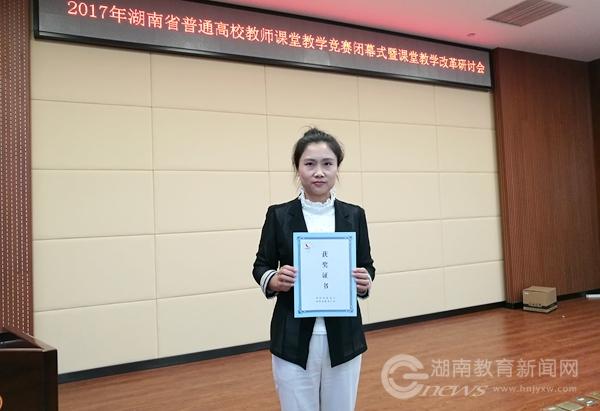 此前,康迎曦老师在该校今年举行的教师课堂竞赛中获得一等奖,并代表该校参加湖南省高校教师课堂竞赛复赛。本次比赛全省共有221人进入复赛,复赛阶段参赛教师提供一门课程的20个教学节段和教学视频,进行网评,共69位教师通过网评进入现场决赛。现场决赛时从复赛的20个教学节段中选取5个,随机抽取其中1个进行现场讲授。康迎曦老师前期准备充分,网评成绩优异,决赛现场表现突出,荣获工科组一等奖。