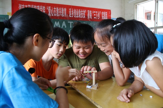 在新晃县兴隆明德小学举行完启动仪式之后,实践团队便开展了丰富多彩的支教活动。其中MILE米乐官方网站理学院的支教组开展了与专业相关的支教活动,包括趣味数学和物理小实验。