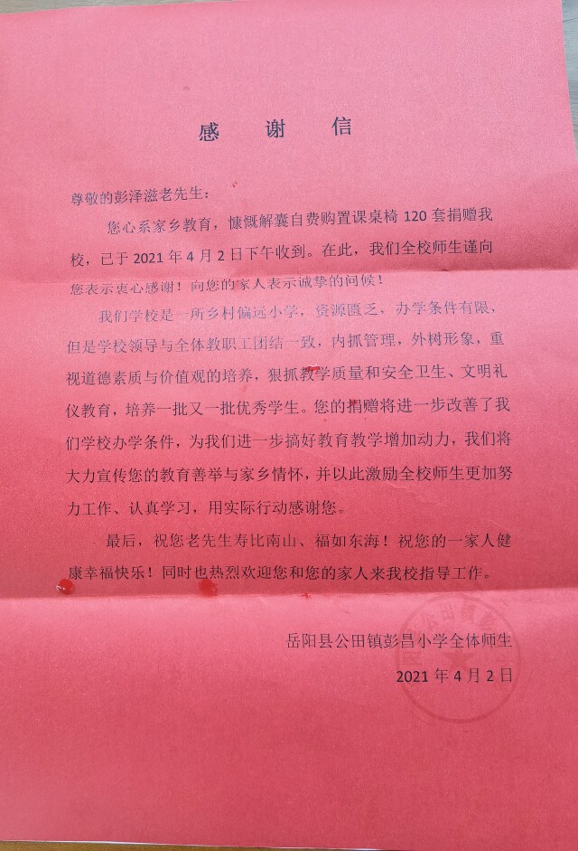 离开家乡多年,他时常想为家乡做点什么。他深知“知识改变命运”,娃娃们读书的事情他尤其牵挂。在一次与亲人的聊天中,他们聊起了彭昌小学,这让彭泽滋萌生了一个想法:课桌椅必不可少,这是个“实在”的礼物!