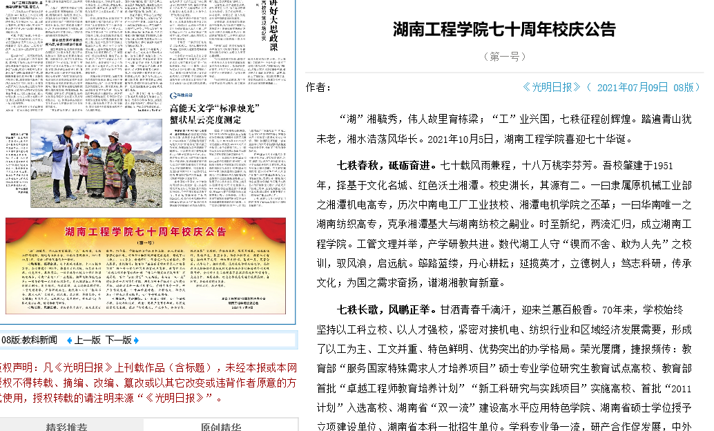 七秩长歌,风鹏正举。甘洒青春千滴汗,迎来兰蕙百般香。70年来,学校始终坚持以工科立校、以人才强校,紧密对接机电、纺织行业和区域经济发展需要,形成了以工为主、工文并重、特色鲜明、优势突出的办学格局。荣光屡膺,捷报频传:教育部“服务国家特殊需求人才培养项目”硕士专业学位研究生教育试点高校、教育部首批“卓越工程师教育培养计划”“新工科研究与实践项目”实施高校、首批“2011计划”入选高校、湖南省“双一流”建设高水平应用特色学院、湖南省硕士学位授予立项建设单位、湖南省本科一批招生单位。学科专业争一流,研产合作促发展,中外办学显特色。云程远大,踔厉风发;十四五远景放眼量,七十年峥嵘正图强。