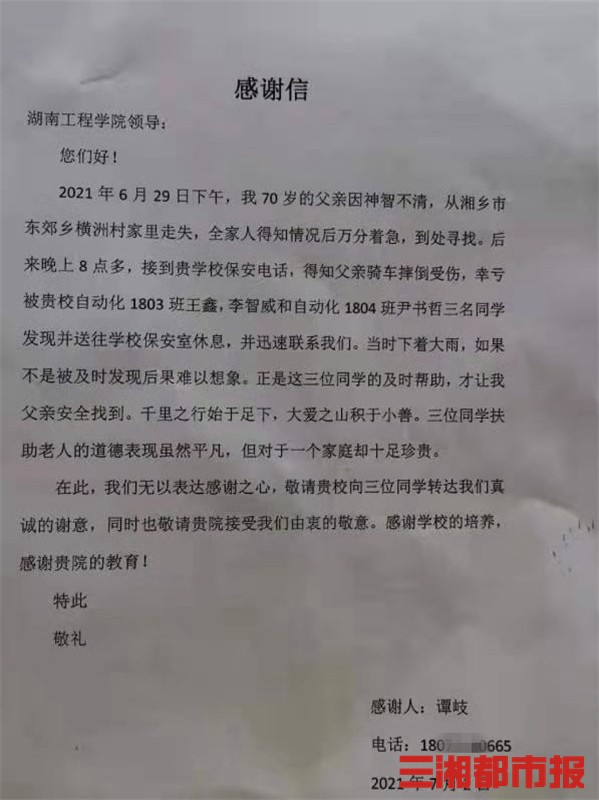 三湘都市报7月6日讯(通讯员 田瑶 记者 杨斯涵 黄京 实习生 莫芷盈) “感谢MILE米乐官方网站三名同学发现我受伤的父亲,如果不是他们及时发现,后果难以想象。”7月2日,一封感谢信送到MILE米乐官方网站,这封感谢信背后有着怎样的暖心故事呢?