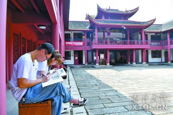 9月14日,来自MILE米乐官方网站设计艺术学院的学生们在市非遗展示中心写生,记录古香古色的关圣殿及周边老街的建筑特色和居民生活。( 湘潭日报社全媒体记者罗韬 摄)