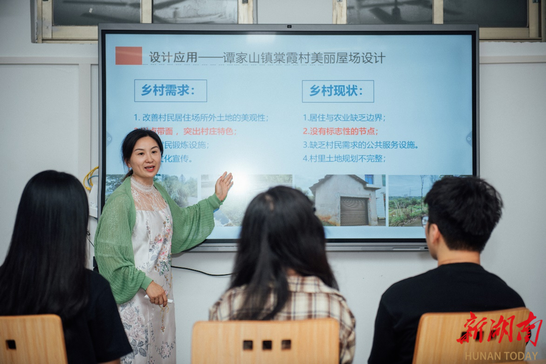 课堂外,谢林霞深度融合环境设计专业特色,注重“设计下乡”“古村落保护调研”等实践活动。她顶着烈日,带领学生实地走访村落,调研建筑风格、公共服务设施现状及周边人文生态环境等情况。在2019年、2021年湘潭市“设计下乡”建设美丽新农村人居环境设计中,她现场教学,用设计创新助力乡村振兴,得到当地政府和村民一致好评。