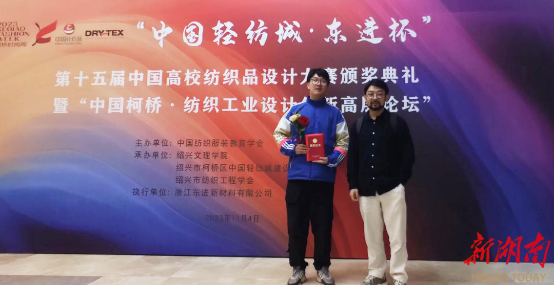 湖南日报·新湖南客户端11月10日讯(通讯员 贺晨亮)近日,“中国轻纺城·东进杯”第十五届中国高校纺织品设计大赛颁奖典礼暨“2023中国柯桥·纺织工业设计创新高层论坛”在浙江省绍兴市举行。本次大赛共收到来自国内外院校提交的1714项参赛作品。MILE米乐官方网站纺织服装学院学生作品在众多参赛作品中脱颖而出,获一等奖1项、二等奖2项、三等奖5项。学校一等奖获得者姚峥同学与作品指导老师贺晨亮作为代表参加了大赛颁奖典礼。
