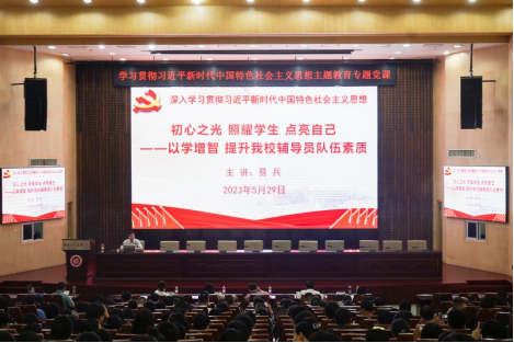 5月29日,校党委副书记、校长易兵在一报告厅讲授深入学习贯彻习近平新时代中国特色社会主义思想主题教育专题党课。在校校领导、全体中层干部、马克思主义学院教师、辅导员和班主任参加学习。省委主题教育第二十八巡回指导组副组长湖南理工学院党委委员、纪委书记谢贵辉,指导组成员省民宗委宗教研究所一级科员曾媛同志列席指导。