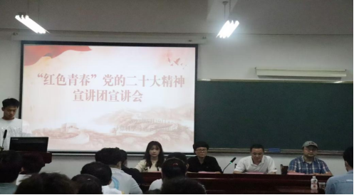 “同学们,今天我们来学习党的二十大报告里的关键词,这一期的关键词是‘两个结合’。即坚持把马克思主义基本原理与中国具体实际相结合,与中华优秀传统文化相结合,坚持“两个结合”是马克思主义永葆生机活力的源泉,体现出马克思主义强大的生命力……”宣讲中,“红色青春”宣讲团成员时冰鑫和郭俊杰分别以“理解‘马克思主义中国化时代化’”“非凡十年铸就丰碑”为主题进行了宣讲。